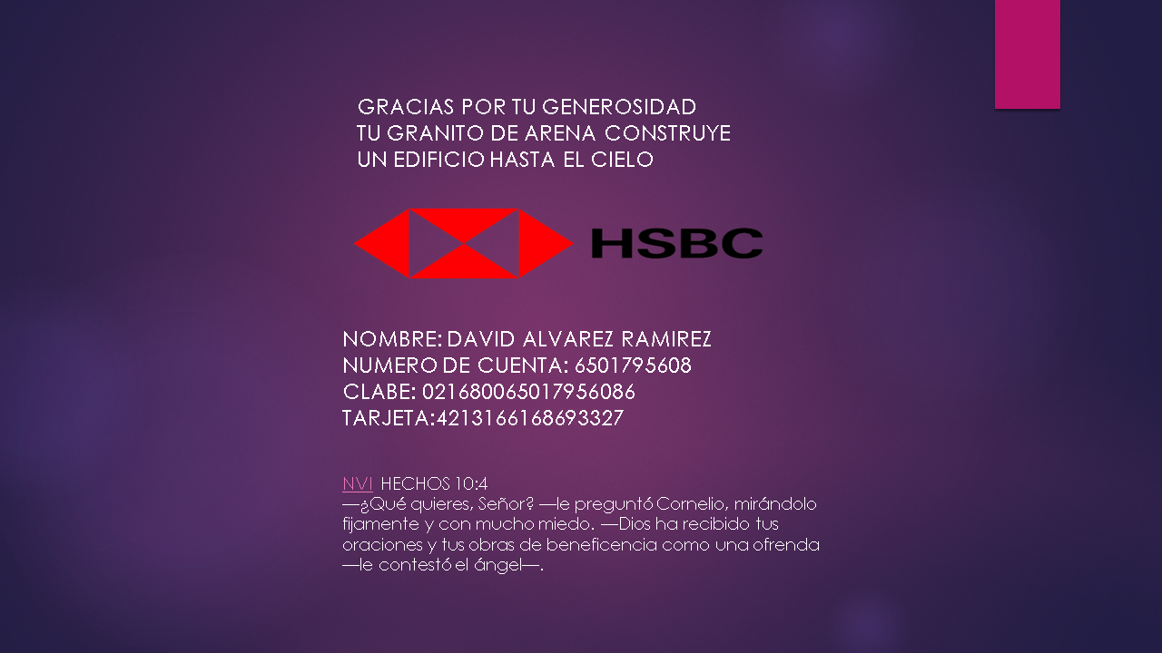 Hechos 10:31  varón me dijo: "Cornelio, Dios ha escuchado tus oraciones, y la ayuda que has dado a otros la ha recibido como una ofrenda.